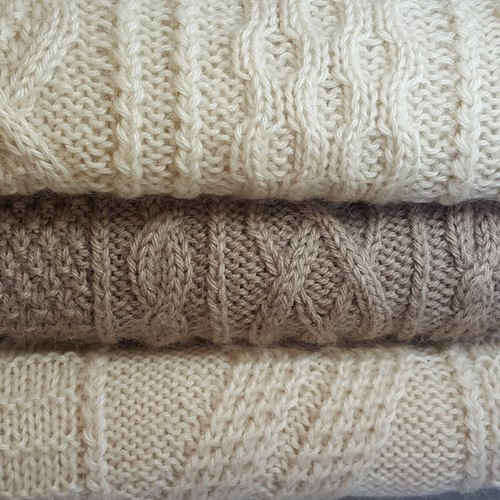 A limited number of hand knitted Arans in our 60% Mohair / 40% Merino Wool yarn.